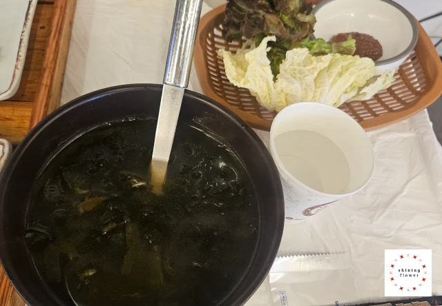 다음으로는 미역국과 쌈채소를 셋팅해주셨어요. 미역국은 다른 건더기 없이 맑은 미역국물이었는데 깔끔한 맛이 괜찮았어요. 쌈채소는 상추와 배춧잎 몇 장을 주셨는데 고기가 아니라 생선이라 그다지 먹어지진 않았던 것 같아요.