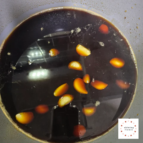 5. 간장물이 한소끔 끓으면 통마늘(또는 간 마늘 대체 가능)을 넣는다.