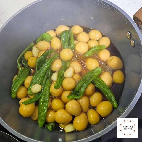 6. 깐메추리알을 넣고 끓인다. 처음 10분 정도 센 불에서 끓이고,