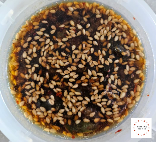 진간장3:고춧가루0.5:참기름1 비율로 양념장을 만들고, 통깨는 적당히 뿌려준다. 쪽파가 있으면 조금 썰어서 넣고, 없다면 대파를 조금 다져 넣어도 좋다.