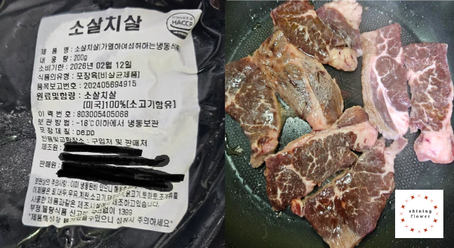 살치살은 등심부위로 마블링이 잘 발달되어 있어 고급부위로 알려져 있다. 육질이 곱고 연하며 지방이 적당히 섞여 있어 맛이 좋고, 결조직이 그물망 형태로 되어 있어 풍미가 좋다고 한다. 그런데 나는 생각보다 기름기도 많다는 생각이 들었고, 기름기를 제거하고 난 살코기 부위는 좀 퍽퍽한 느낌이 들었다. 내가 잘못 구워서 그럴 수도 있다는 생각이 든다. 굽기 전 실물은 지방이 골고루 퍼져 있어서 부드럽고 맛있어 보였는데... 다음부턴 잘 구워봐야겠다.
