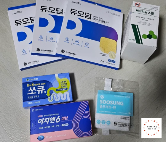 이번에는 집에 구비된 소독약도 모두 사용하고, 거즈도 없어서 상처관리 용품 위주로 구매해보았어요. 그래서 듀오덤 3통, 거즈 1봉, 알코올 스왑 1통을 구매했어요. 그리고 간 김에 소화제 1 통과 이지엔 6 이브도 함께 사 왔답니다.