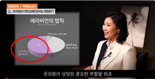: 얼마전 동영상에서 이미지브랜딩 하시는 박영실 교수님이 나오셔서 말씀하시는데 처음 만나는 사람의 첫인상에 옷차림이 가장 중요하다고 역설한다. 옷차림은 자신을 대변하는 것이니 만큼 비싸고 좋은 옷이 아니라 단정하고 깔끔한 차림새, 상황과 장소에 맞는 옷을 입되, 나답지만, 남다르게, 자연스럽게 입어야 한다고 팁을 주신다.