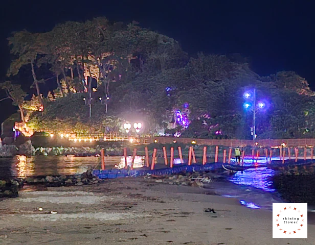 저희가 도착한 시간이 저녁 9시 30분경이었는데요, 관람 안내 도우미 분들께서 앞에서 못 들어가게 지키고 계셔서 여쭤보니 만조라서 물이 많아 다리가 잠기면 위험하니 못 들어간다고 하시더라고요. 그래서 저희뿐만 아니라 여러 명의 사람들이 앞에서 대기 중이었답니다. 일단 10시까지 기다려보고 물때가 맞으면 입장가능하고, 여전히 물이 많아서 다리가 출렁거리면 입장이 안된다고 하셨어요. 그래서 일단 여기까지 온 거 30분 기다려 보자며 10시까지 기다려보기로 했죠.