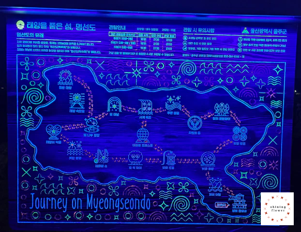 명선도 앞에 있는 관람안내 표지판이었는데요, 표지판까지 화려한 조명으로 블링블링한 게 확실히 남달랐답니다. 관람안내 표지판에는 섬의 유래, 관람안내 시간, 유의사항, 섬 내부 구조 및 설명에 대해 안내되어 있었어요.