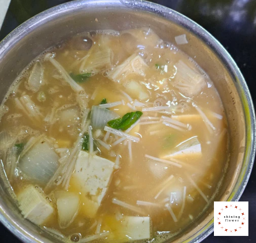4. 된장푼 육수 끓으면 모든 야채 넣기