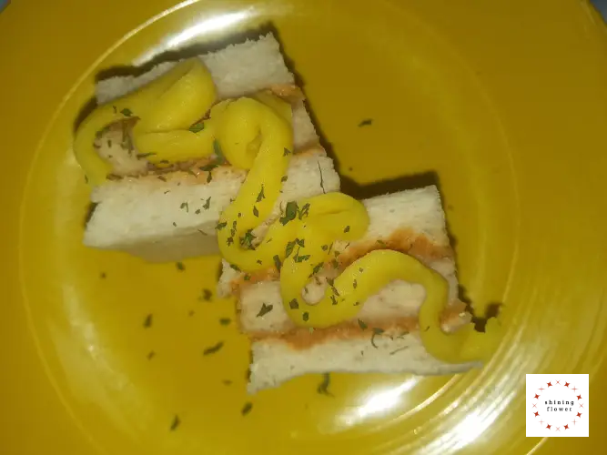 4. 돈가스가 모두 구워졌으면 소스를 바른 식빵 중간에 넣어서 2등분 또는 한 입 크기로 4 등분해서 잘라 주세요.